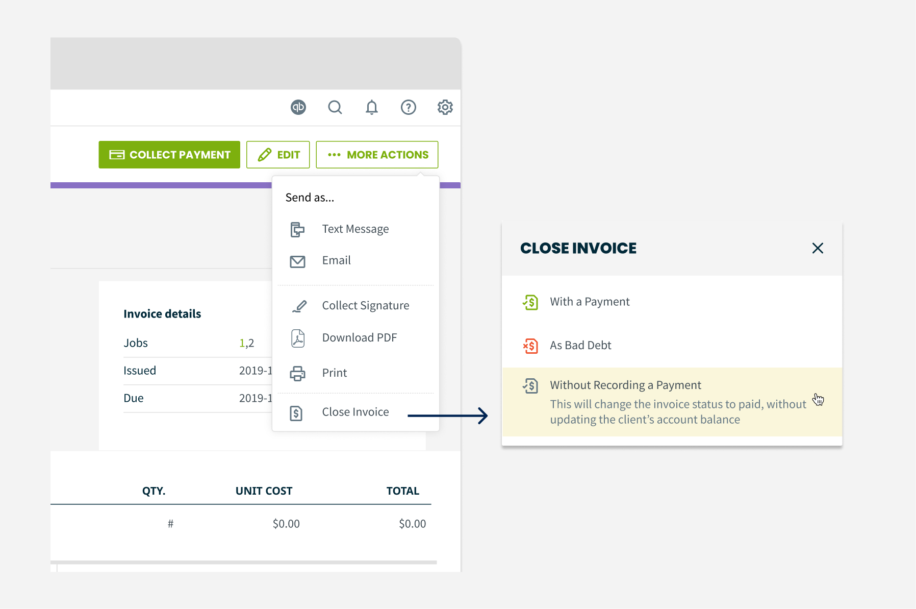 We also introduced a third option, “With a Payment”, which triggers the same modal shown when selecting the main “Collect Payment” button. This keeps the experience consistent and closes the loop for users who intend to record a payment.